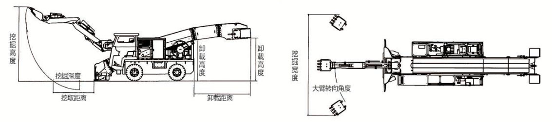 本机采用电动全液压传动,液压行走、挖掘采集、输送、装车四种功能,结构紧凑,推进力大,扒取范围广,可以全断面装岩,不需人工辅助清理工作面;本机主要动作采用先导阀控制,操作轻松简便,工作平稳无冲击,维修方便,液压系统采用风冷,有驾驶棚,工作轻便,动作举升定位准,运料速度快,大量节省人力等特点,符合人机工程学。